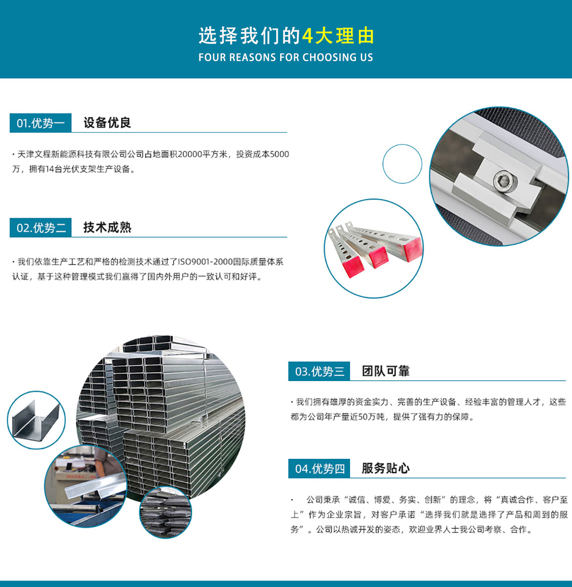 天津文程新能源科技有限公司成立于2021年,是專注于集中式、分布式、漁光互補(bǔ)和農(nóng)光互補(bǔ)等清潔能源發(fā)電的綜合性企業(yè) 公司是集設(shè)計(jì)、研發(fā)、生產(chǎn)、制造為一體的綜合型企業(yè)。公司占地面積20000平方米,注冊(cè)資金5000萬元整。公司坐落于華北鋼鐵重鎮(zhèn)--大邱莊,距天津市區(qū)50公里、鄰104和205國(guó)道及京滬高速,交通十分便捷。 本公司擁有三個(gè)生產(chǎn)車間,其中兩個(gè)冷彎型鋼車間,一個(gè)鋅鋁鎂型鋼車間,擁有自動(dòng)冷彎成型機(jī)10條,自動(dòng)數(shù)控沖孔機(jī)10條以及焊接加工等設(shè)備。主要生產(chǎn)產(chǎn)品有:太陽能光伏支架、各種規(guī)格的C/Z/U型鋼、抗震支架、管廊支架及整套配件等。